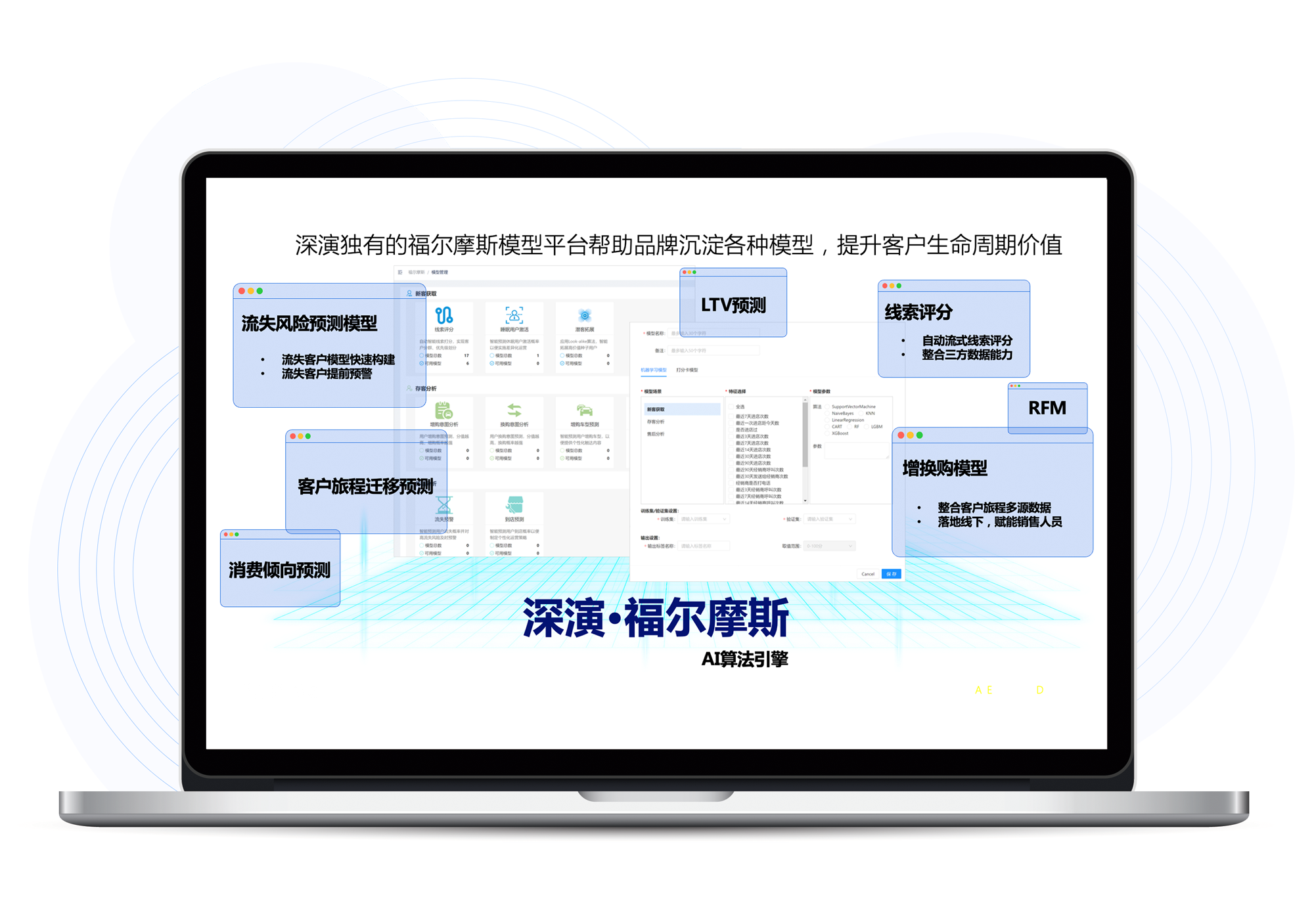 福尔摩斯AI是sungame智能自主研发的AI算法模型平台,内嵌广告和用户运营两大模型体系,为sungame智能营销决策云提供底层能力支撑,提升客户全生命周期价值